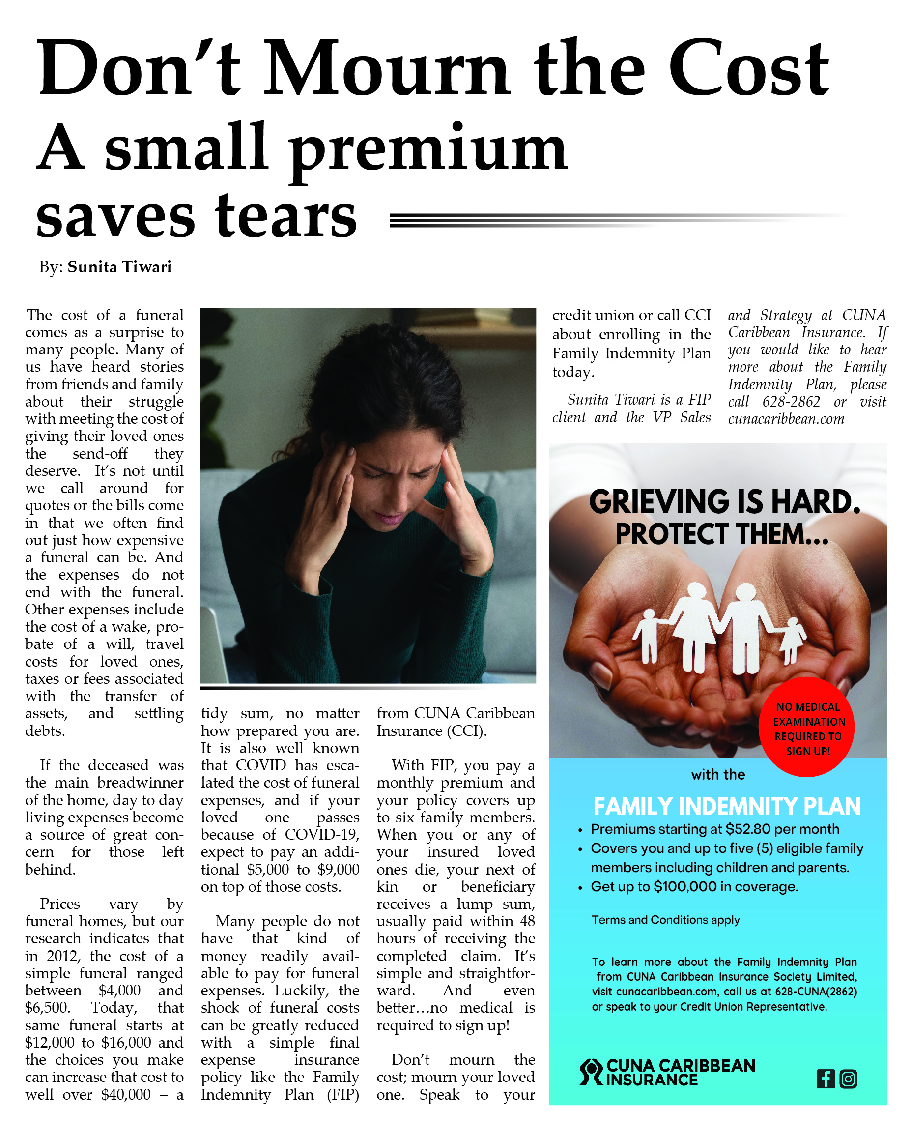 Grieving is hard. But the end of life should not mean the start of financial hardship. Designed to help you and your family with funeral costs and other immediate final expenses such as debt and medical expenses, the Family Indemnity Plan (FIP) from CUNA Caribbean Insurance ensures that your loved ones are cared for giving them peace of mind and financial security in a time of loss. Don’t leave your loved ones to bear the burden of high funeral costs and other end-of-life expenses in a time of mourning.